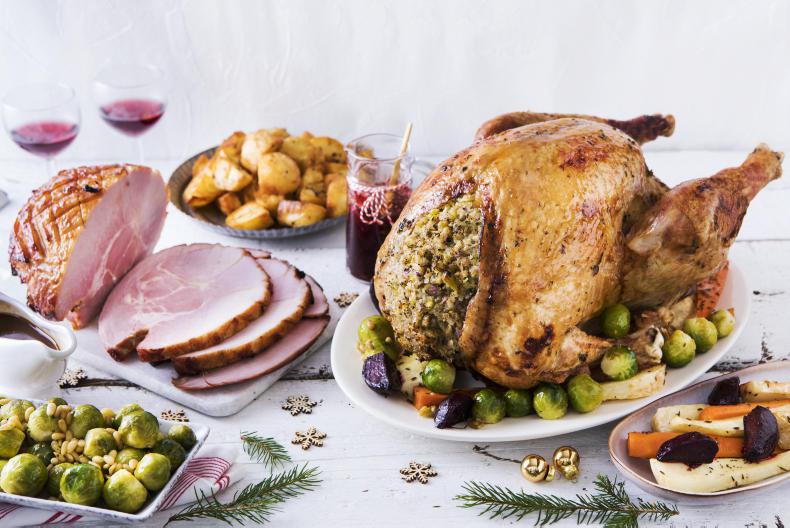 Adorn your plates with roast turkey accompanied by citrus butter, pistachio stuffing and cranberry gravy. Pair that with glazed ham, herby roast potatoes, maple and cumin roots and colourful braised red cabbage. A Christmas triumph.