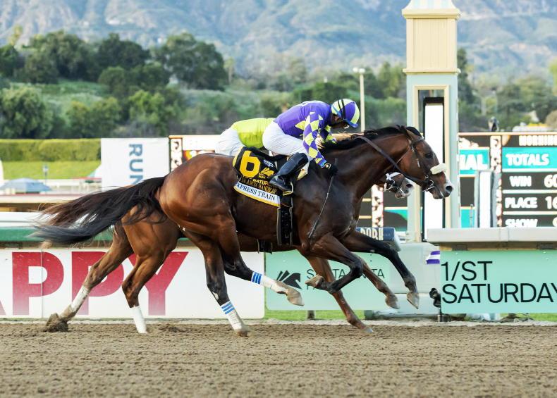 Express Train edged out classic-placed Grade 1 winner Hot Rod Charlie in the $201,000 Grade 2 San Antonio Stakes for a nose victory.