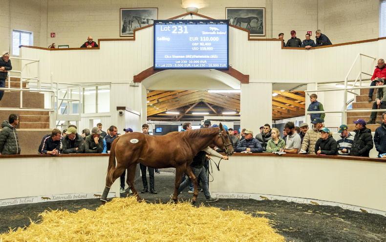 The greatest increase in value at the September Yearling Sale was Grangemore Stud’s Shaman colt out of Periwinkle. Bought as a foal for €16,000, he was knocked down to Alex Elliott for €110,000.