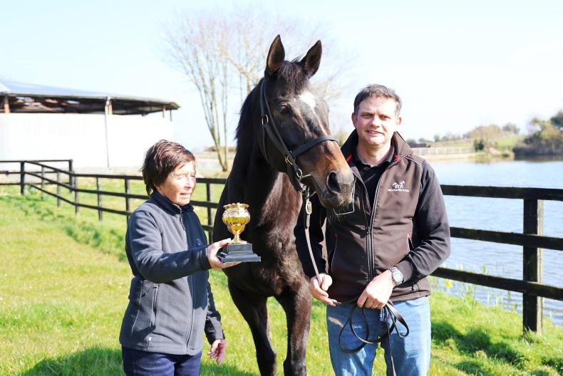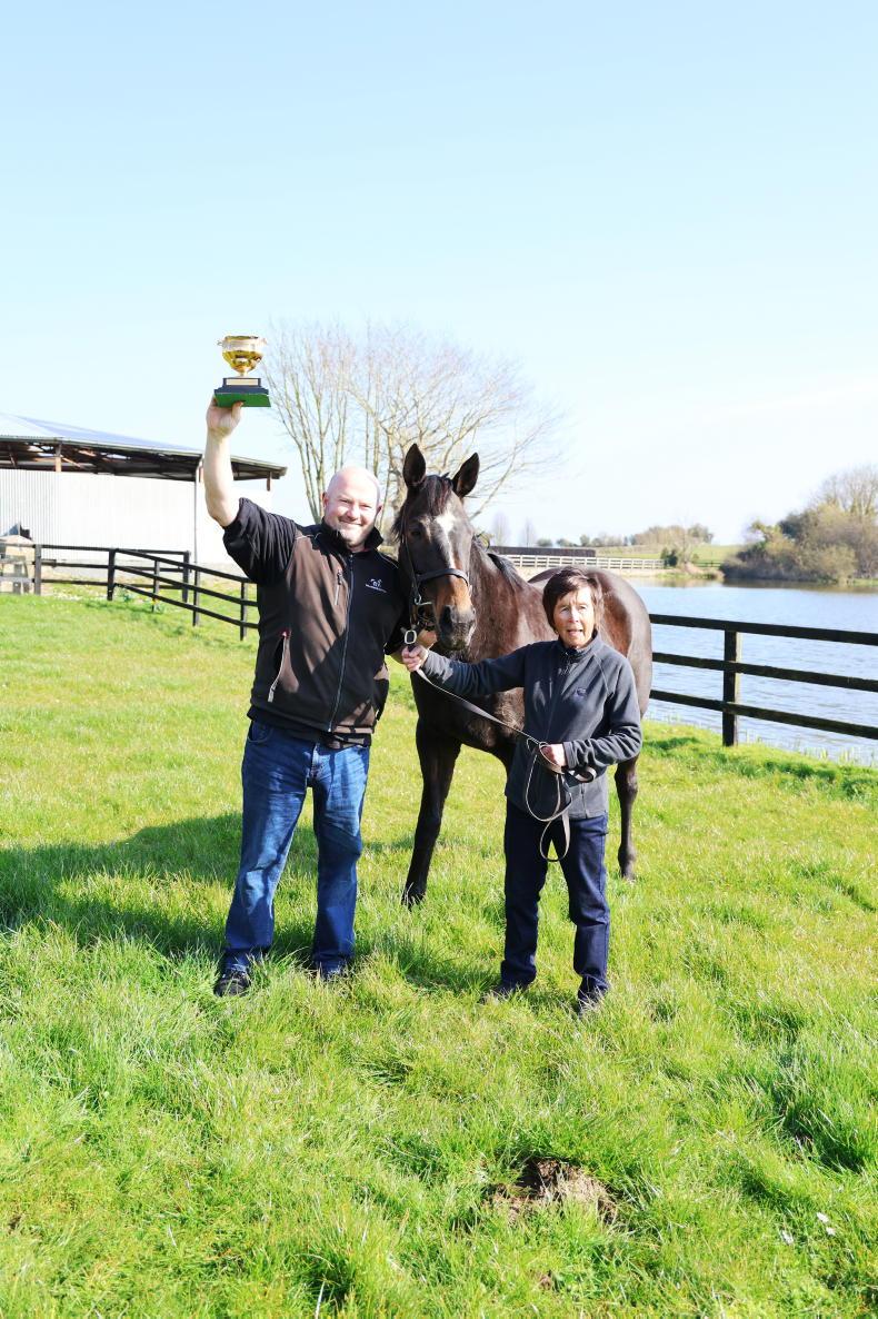 caption: Susan Hogan proudly holds the Gold Cup with Islanmore Stud manager Nigel Anderton