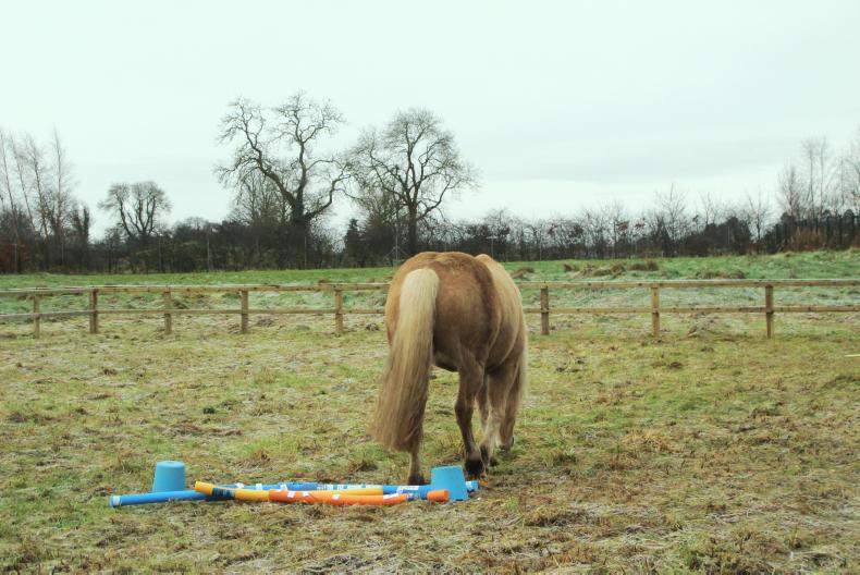 The students are currently exploring the topic of ‘communication’ and this was the students’ second session on this particular topic. At the beginning of the class, students were asked to write down a strength that they have, and something that hinders them achieving a goal. They were then asked to place a label with their hindrance written on it on an obstacle (in this case a little jump) and then to place their strength label onto an object which they would have to carry with them throughout the task, the object might be a ball, cone or toy. This week’s task was to work together as a group, to get one of the two horses to step over the obstacle labelled with the students’ hindrances (which can be seen in the accompanying images).