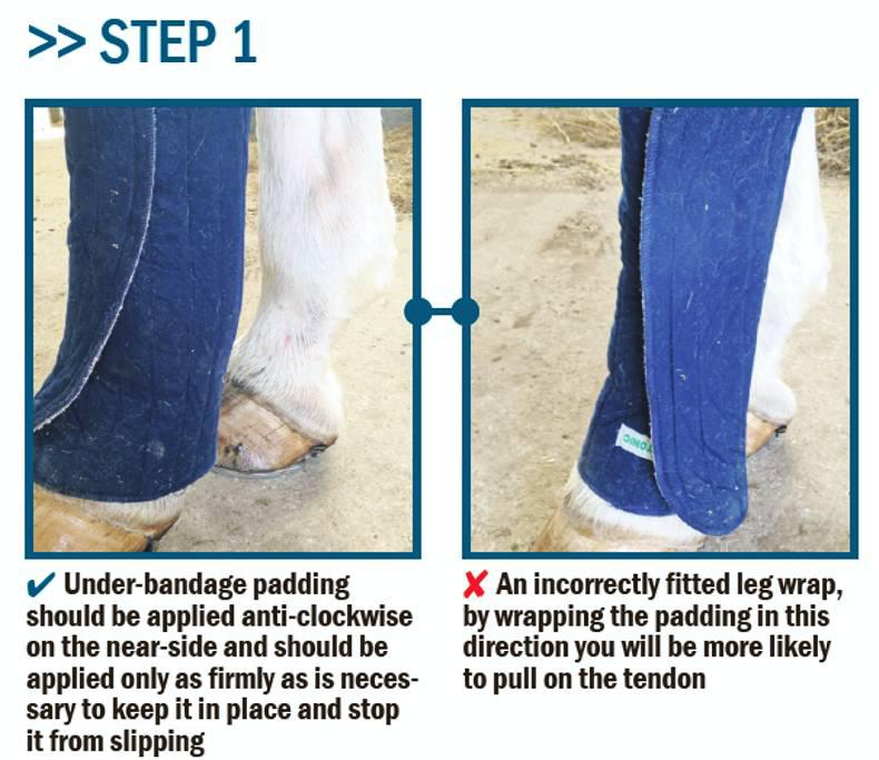 Place the under-bandage padding securely around the leg. It should be applied only as firmly as is necessary to keep it in place and stop it from slipping.