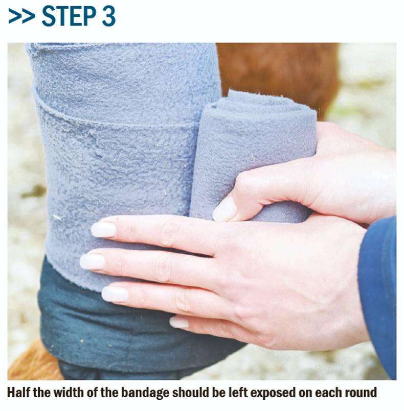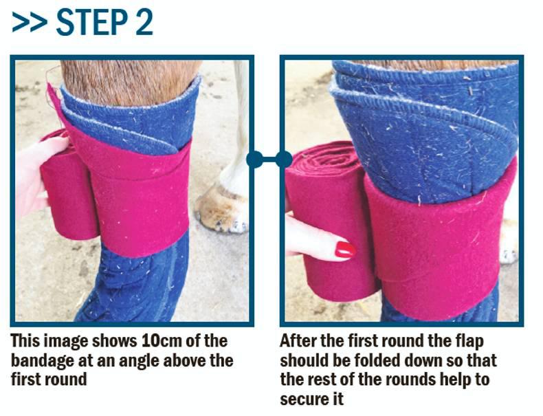 Place approximately 10cm of the bandage at an angle above the first round. Start bandaging in the same direction as the overlap of the lining just below the knee or hock. The bandage should be firm and should hold the flap of the bandage in place. After the first round the flap should be folded down so that the rest of the rounds help to secure it.