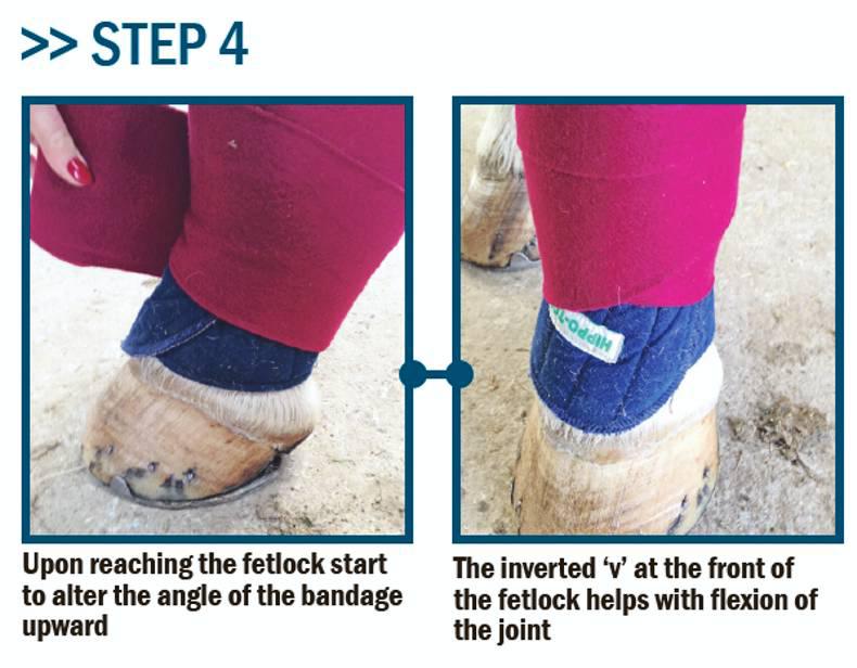 The bandage should be wrapped straight across the leg until you reach the fetlock where ideally an inverted ‘V’ is left at the front of the fetlock joint where the bandage crosses itself. This is done by slightly altering the angle of the bandage upward and is done to allow ease of flexion at the fetlock.