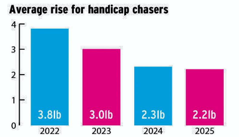 Last year, at this same weights stage, the average difference in Irish and British ratings for those with published marks was 2.9lb higher for non-juvenile hurdlers, 2.3lb higher for handicap chasers and 2.9lb higher for juvenile hurdlers.