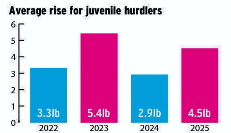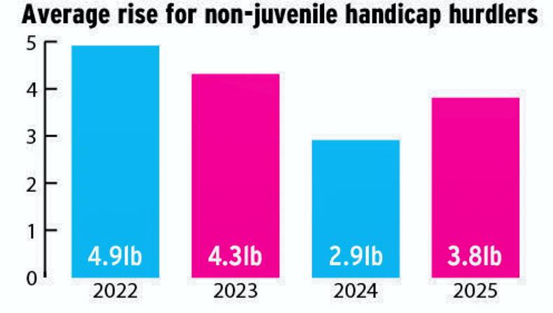 The headline takeouts from this year’s equivalent averages are that non-juvenile handicap hurdlers are now typically 3.8lb higher (from 2.9lb) in Britain than is the case in Ireland and juvenile hurdlers are up an average of 4.5lb (from 2.9lb) versus their Irish marks.