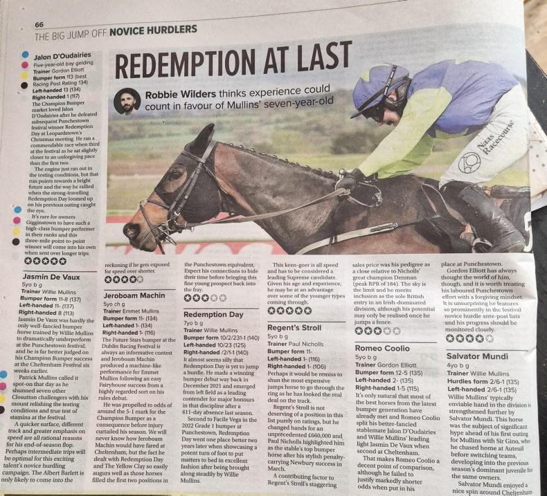 HELP! The Listowel Harvest Festival is supposed to signal the beginning of the jumps season, but it’s a bit crazy that the Cheltenham hype has begun already. Willie Mullins was quoted as saying that Wednesday’s novice hurdle winner Davy Crockett “jumps like a Champion Hurdler already”. Another tabloid headline on Wednesday went: “Willie Mullins could put down a huge Cheltenham marker”.Woah!