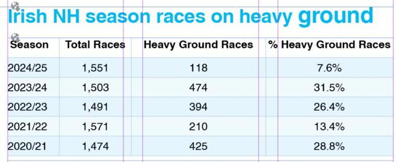 In it, the number of races in each of the past five seasons is given along with the number of races run with heavy in the going description and the percentage of each. Last season had the lowest percentage of races with heavy or soft-to-heavy as the going description, and by a distance too, just 7.6% when a figure in the 20s can be expected. Furthermore, most of the big festivals took place on nice ground last year.