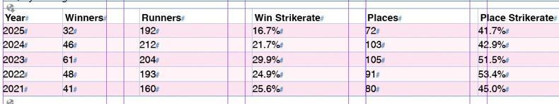 His total winners and win strike rate are at their lowest in the last five years, and by a fair margin too, though his place strike rate is broadly similar to previous years, suggesting a degree of variance. His total November and December winners of 32 in 2025 was the worst he has managed since 2010, while the database I used goes back as far as the 2008/9 National Hunt season and his lowest win strike rate in that period was 21.4%.
