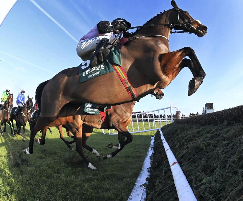 Heart Wood and Darragh O’Keeffe stand off a fence in winning the Grade 3 O’Driscolls Irish Whiskey Chase \ Healy Racing
