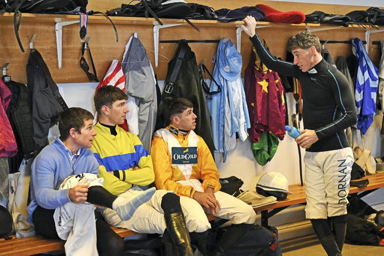 At Limerick, jockey Jack Kennedy pictured with fellow riders L-R Philip Enright, Donagh Meyler and Darragh O’Keeffe telling them about his Far Hills experience where he rode four winners for trainer Gordon Elliott \ Healy Racing