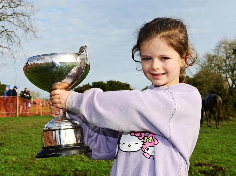 Evie Codd with the James Boyd Memorial Cup won by Grey Balls Of Fire and Brian Lawless in the five-year-old geldings’ maiden Knockmullen House \ Healy Racing