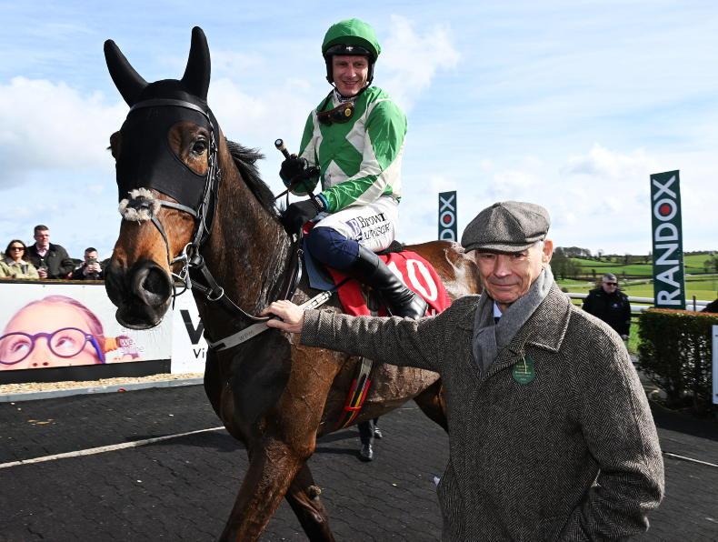 Cheltenham Festival winner The Mourne Rambler on parade for owner Philip Polly (left) and family and friends at Downpatrick \ Healy Racing