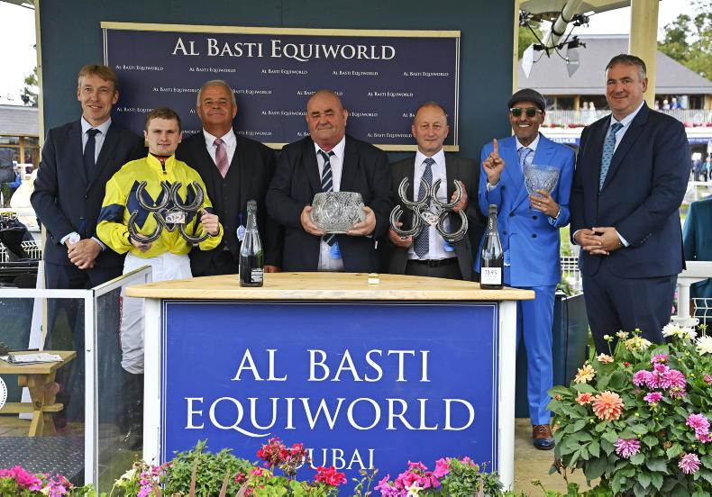 Star Of Mehmas won for owner Jabber Abdullah and trainer Richard Hughes pictured with wife Lizzy and son Harvey \ Healy Racing