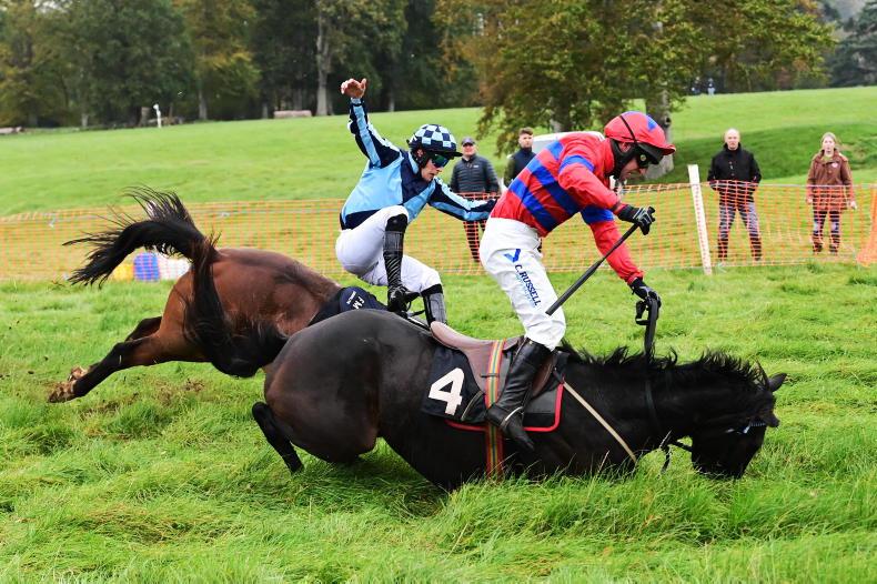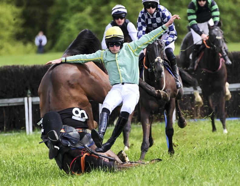Necarne scene as Moll Down Town and Lucas Williams part company at the last in the mares’ maiden \ Healy Racing