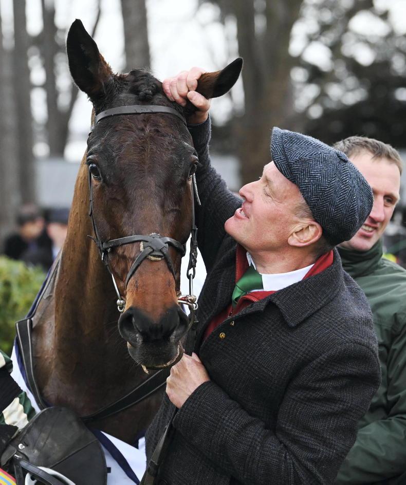 At Cheltenham, trainer Cian Collins with dad Alan behind and Nicky Henderson after Jazzy Matty won the Johnny Henderson Grand Annual Challenge Cup \ Healy Racing