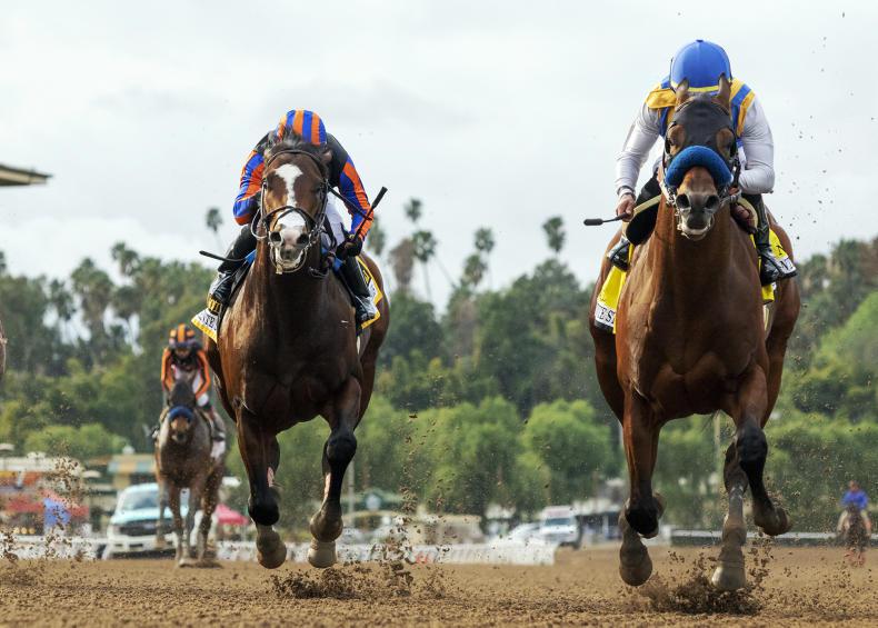Nadal (Joel Rosario, right) overpowers Ginobili (Abel Cedillo), to win the Grade 2 San Vicente Stakes at Santa Anita Park \ Benoit Photo