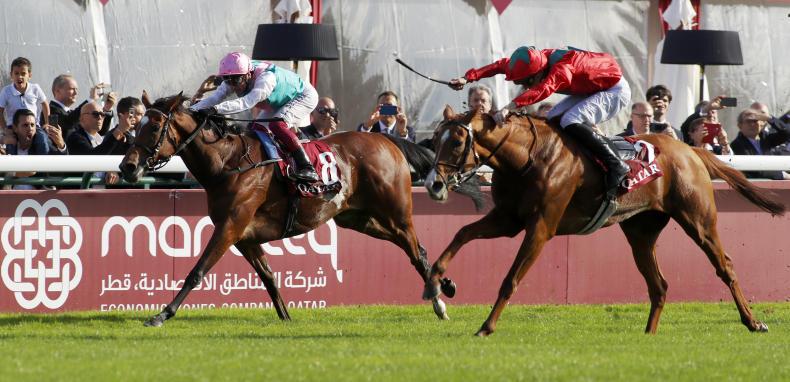Waldgeist and Pierre-Charles Boudot getting up to win the Qatar Prix De L'Arc De Triomphe from Enable (pink cap) \ Healy Racing