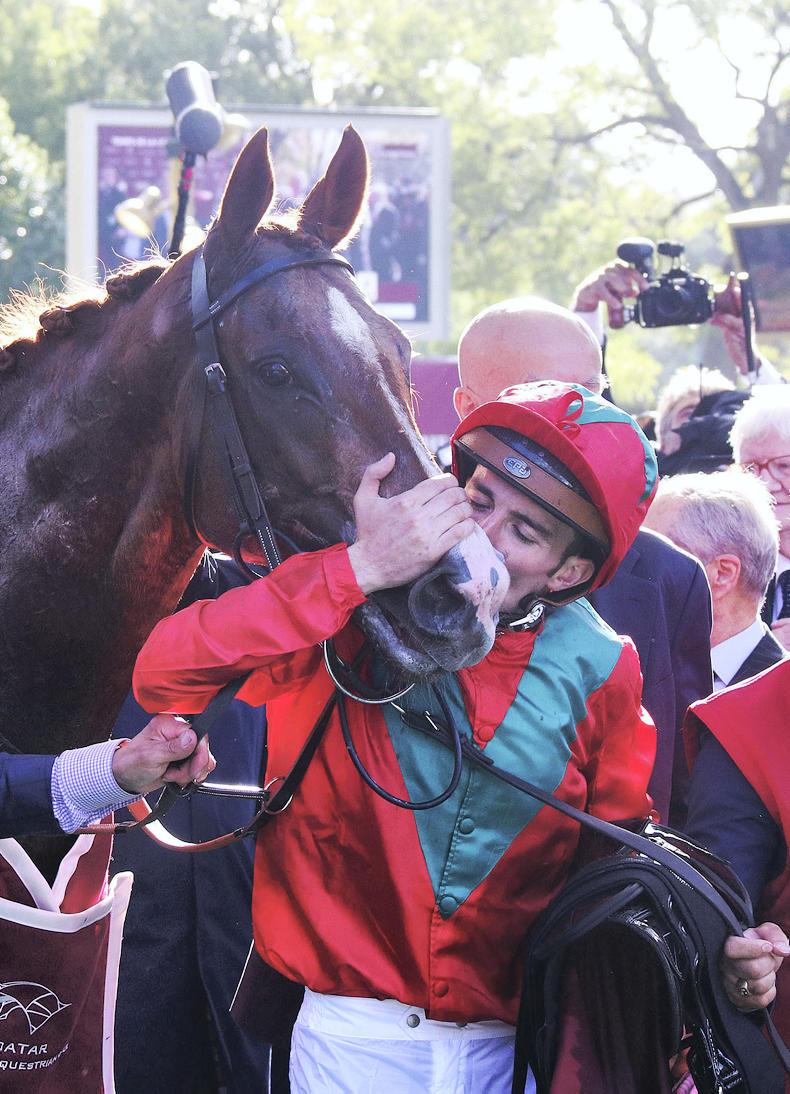Waldgeist gets a kiss from Pierre-Charles Boudot after winning their win \ Healy Racing