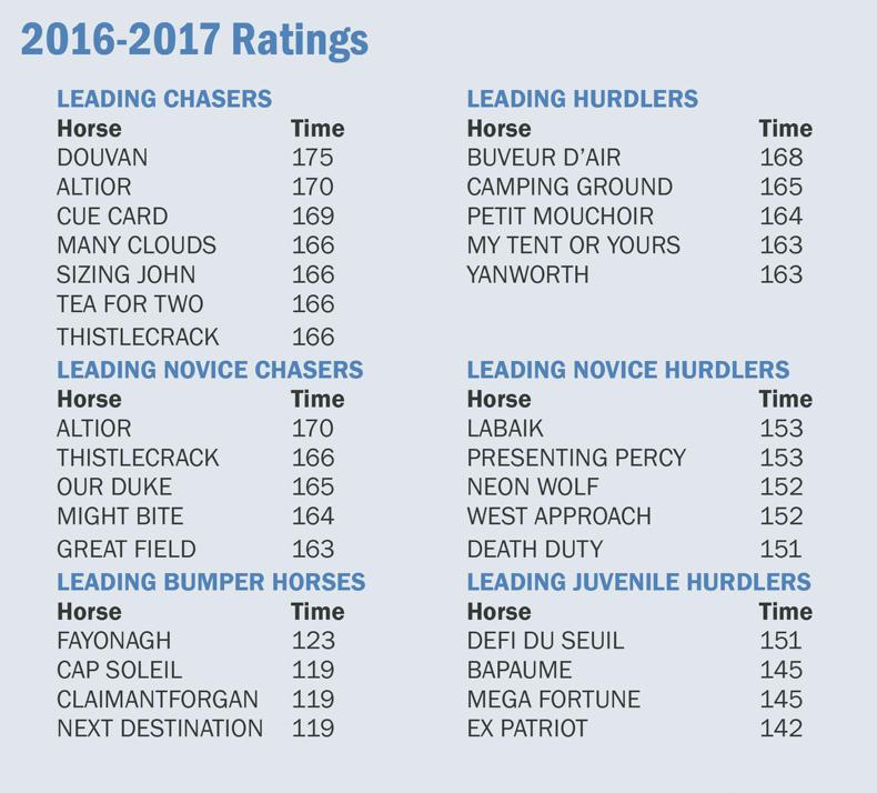 The novice hurdlers were slightly substandard on the clock, but Buveur d’Air switched back from novice chasing to devastating effect to be the top hurdler of the campaign of any description by that measure.