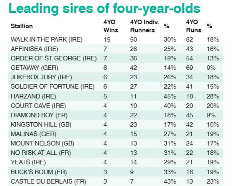 That strike rate, however, also betters the next five stallions on the leaderboard. Affinisea and Order Of St George come in joint second with seven winners apiece, one more than the trio of Getaway, Jukebox Jury and Soldier Of Fortune, who were each responsible for six four-year-old maiden winners.