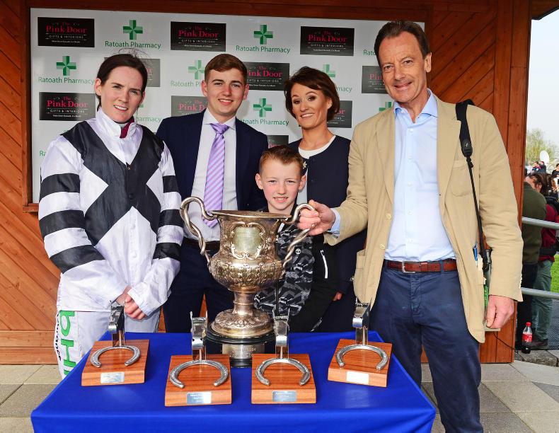 Surf Instructor won for Rachael Blackmore and owner Julian Taylor (right) being presented with the trophy by Ollie, Anthony and Clodagh Ryan of Ratoath Pharmacy for the Ladies National