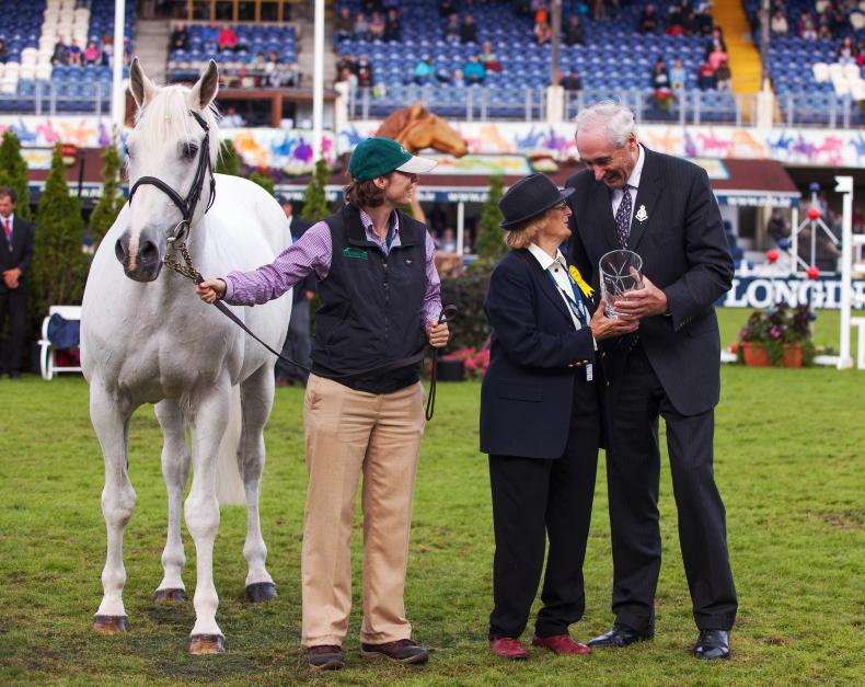Mary McCann of Hartwell Stud receives a special trophy from Matt Dempsey, then President of the RDS, in recognition of Cruising's achievements down through the years. Pictured holding Cruising is Mary's daughter Gina at the 2014 Dublin Horse Show
