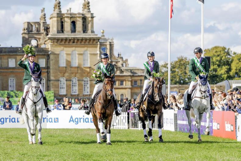 Team Ireland: Ian Cassells with Millridge Atlantis, Padraig McCarthy with Pomp N Circumstance, Aoife Clark with Full Monty De Lacense, Robbie Kearns with Chance Encounter after winning Team Silver at the FEI Eventing European Championship Blenheim Palace 2025 \ Irish Eventing Times