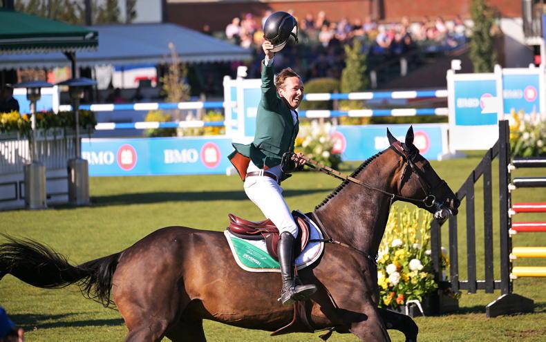 Bertram Allen celebrates after jumping double clear with Pacino Amiro (ISH) and securing victory for Ireland at the CSIO5* Spruce Meadows Masters \ Spruce Meadows
