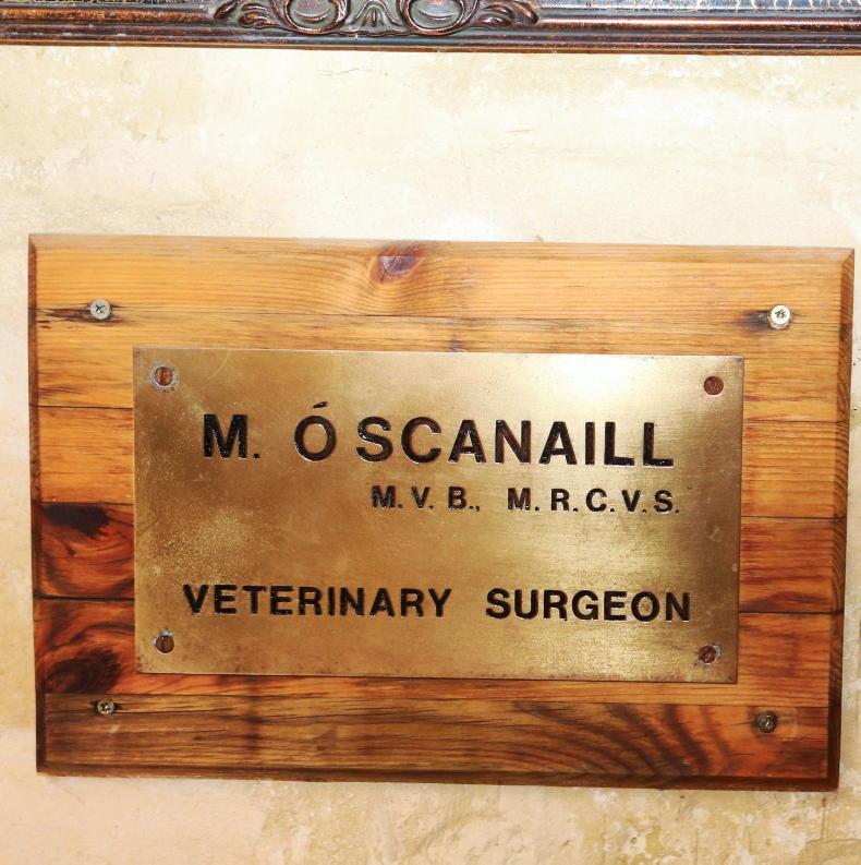 Just inside the front door is another bespoke item: a brass and wooden name-plate with M. Ó Scannaill, M.V.B, M.R.C.V.S Veterinary Surgeon engraved on it.