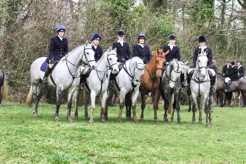 Raymond O’Halloran led the way on his new horse’s first day. This horse had been found by Dermot O’Halloran (Raymie’s brother) on a day with the Limerick Harriers. This chesnut had showjumped at a high level before returning to hunting and had been produced by Dessie and Danielle Lenihan who produce some outstanding hunters. Hot on his heels were his three whips, then gate-openers and general assistants Johnny Halligan and Mark Clery, who had to ready to peel off their horses in a split second to keep the action going. Purcell’s single resulted in at least half a dozen jockeys taking up beagling but happily they all got reunited and continued.