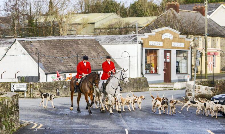 The Island Foxhounds, led by huntsman Paul Scallan (on grey) and whipper-in Albert Whitehead head off from Blackwater last Saturday \ Siobhan English