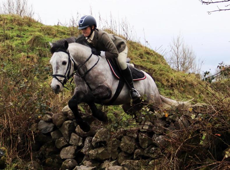 Billy Dalton North Galway Foxhounds crossing a stone wall out with the North Galway Foxhounds in Belclare \ Maura Morrin