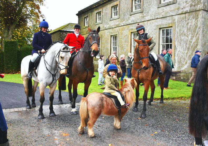Meath joint master Niall O'Regan and his daughters Emily and Maisie, and Francesca Fox and her pony Tiny at the Meath Foxhounds meet at Ardbraccan House \ Noel Mullins
