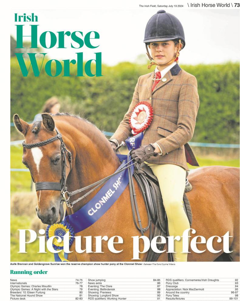 The showing world got a look-in at times. “Aoife Brennan and Goldengrove Sunrise won the reserve champion show hunter pony at the Clonmel Show” (July 13th); “Penny Hudson and Hudsons Mermus, the Connolly’s Red Mills ridden horse champion of champions at the Wicklow Hunt Show in Barnadown (July 20th); and, finally, “Jamie Smyth taking a lap of honour on Tattygare Me Me Me after the four-year-old mare was crowned supreme hunter champion in the Main Arena at the 2024 Dublin Horse Show” (August 24th).