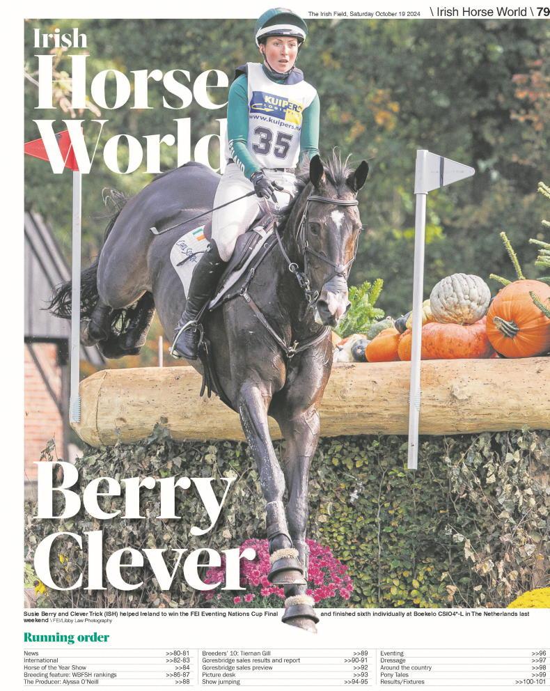 While photographed in the inside pages of the Irish Horse World parading with Padraig McCarthy, Austin O’Connor and Aoife Clark, the front cover featured “Susie Berry and Clever Trick (ISH) helped Ireland to win the FEI Eventing Nations Cup Final and finished sixth individually at Boekelo CSIO4*-L last weekend” (October 19th).
