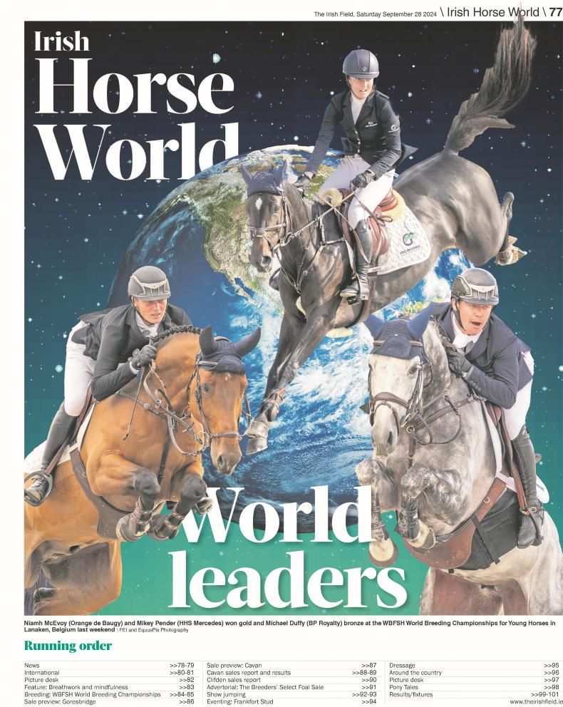 Senior riders also featured when “Niamh McEvoy (Orange de Baugy) and Mikey Pender (HHS Mercedes) won gold and Michael Duffy (BP Royalty) bronze at the WBFSH World Breeding Championships for Young Horses in Lanaken, Belgium last weekend” (September 28th).