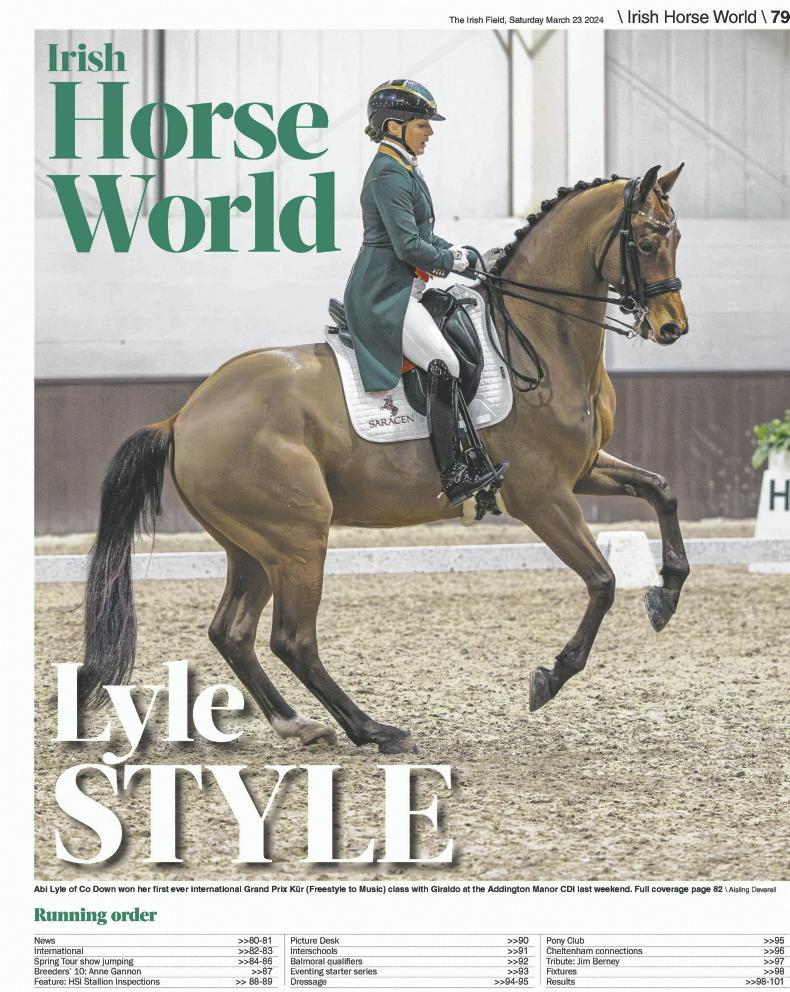 Bang centre of those stars was Michael Murphy, The Irish Field dressage rider of the year for 2023 and, later in the month, it was the 2022 winner of that title, who featured on the front page. “Abi Lyle of Co Down won her first ever international Grand Prix Kür (Freestyle to Music) class with Giraldo at the Addington Manor CDI last weekend” (23rd).