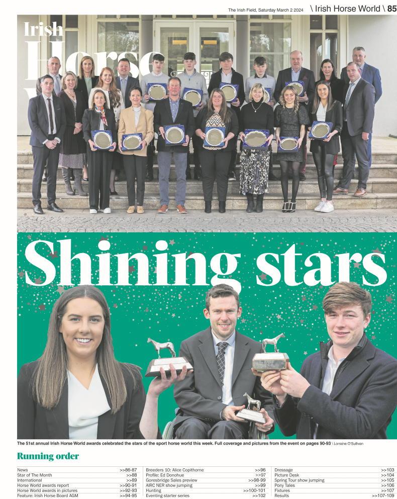 A collage of photographs fronted the Irish Horse World in March 2024. “The 51st annual Irish Horse World awards celebrated the stars of the sport horse world this week” (2nd).