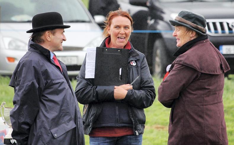 Despite the bad weather, the ever-cheerful Bridgette in conversation with judges Luke Morley and Bernie Stack at the 2017 West Clare show. Photo Susan Finnerty