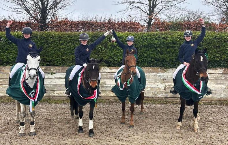 Novice teams league winners, Loreto Wexford: Firefly Kadie (Izzy Bates), Jumpingdale Peanut (Ruby Cousins), Curraghmore Sparrow (Shannon Griffith) and WNDA Toby (Caitin Griffith), pictured at the TRI Equestrian Interschools final at Coilog