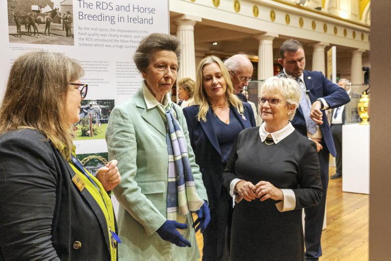 Princess Anne is walked through the Dublin Horse Show special 150th exhibition by journalist Louise Parkes and Natasha Serne, Head of Library and Archives at The RDS \ Claire Nash