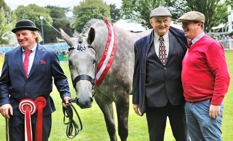 Liam Lynskey with Kathleen Gielty-Cunney’s Foxford Nina (Cappa Aristocrat), the reserve champion Irish Draught and Matthew O’Meara and Brian Murphy from the Irish Draught mare class sponsors, the IDHBA \ Susan Finnerty
