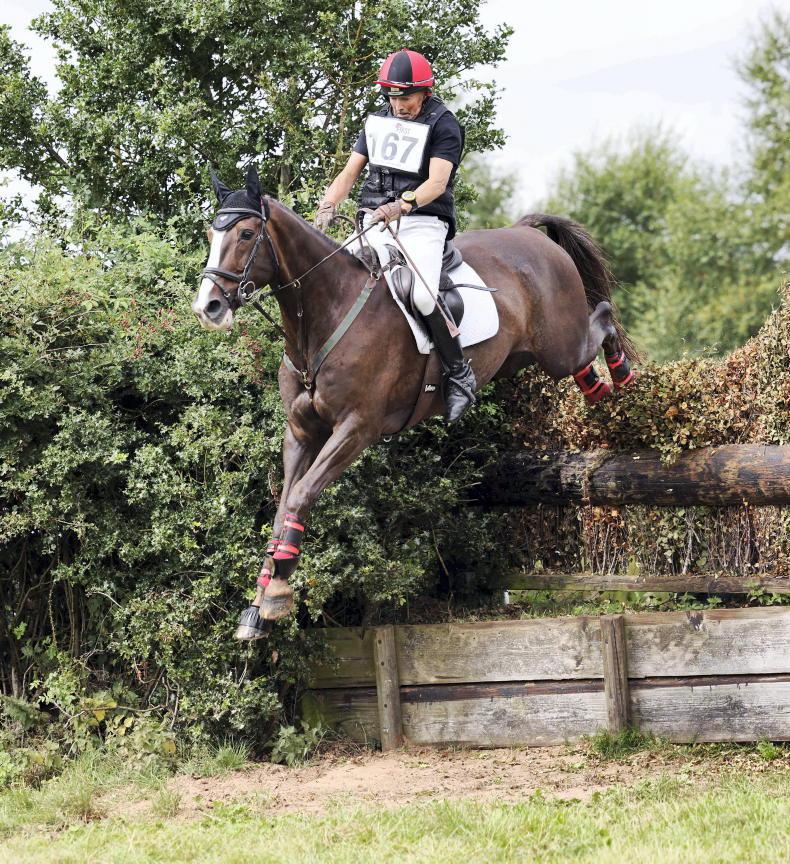 Denis Currie and Merlot clear the birch drop at Finvoy where they won the EI110(Amateur) class \ Anne Hughes