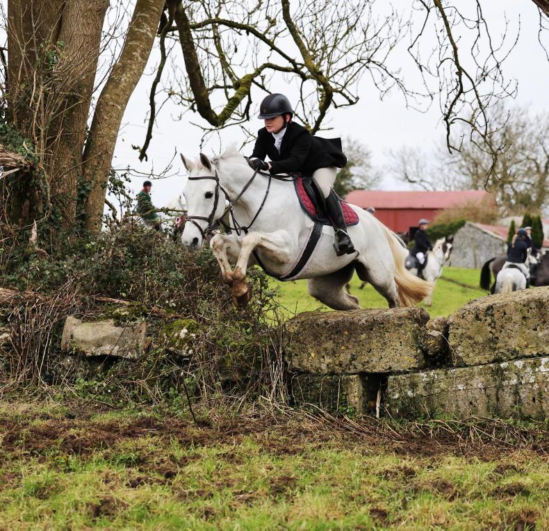 Brian’s farm is run on extensive lines and is ideal for hunting, with loads of walls which were enjoyed by all. It was second season home-bred Mobster who found and, as he spoke, the pack rallied to him and they were away and our pilot was hollered away by the eagle-eyed young whipper-in Oisin.