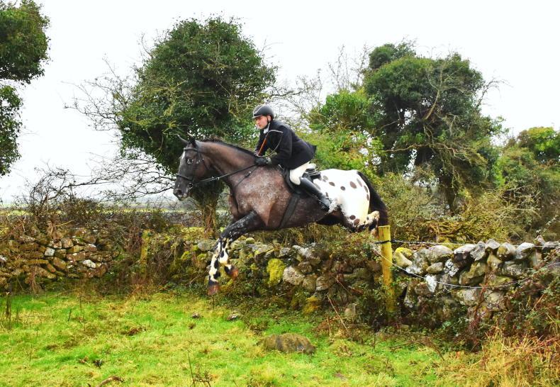 Ben Johnston on his Appaloosa taking on a double stone wall at the North Galway Foxhounds meet at Ger O'Briens Farm \ Noel Mullins