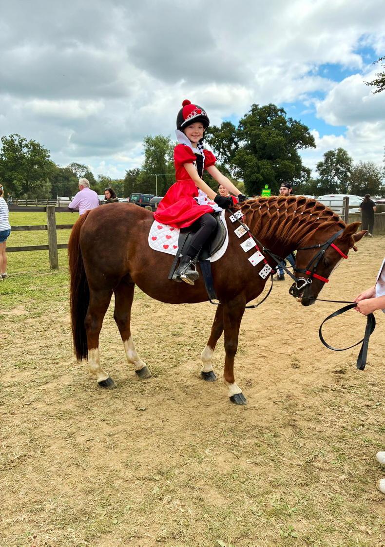 Emily Lawlor dressed as The Queen of Hearts in the Fancy Dress Class on her pony Reeno at the Iverk Show