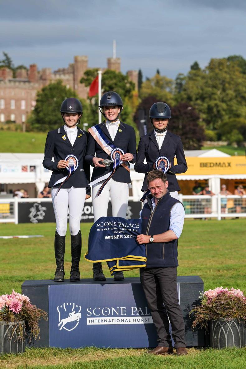 Ireland's Molly Egan (1st), Susan O'Brien (2nd) and Britain's Eva Bryant (3rd) during the CCIP2*prize giving at Scone Palace International Horse Trials