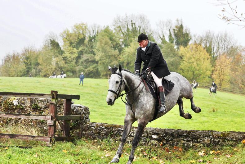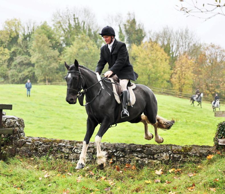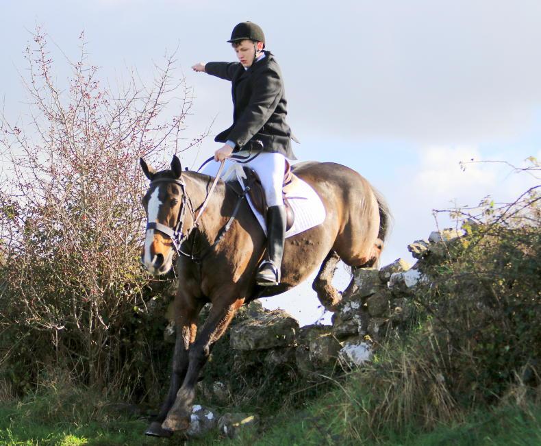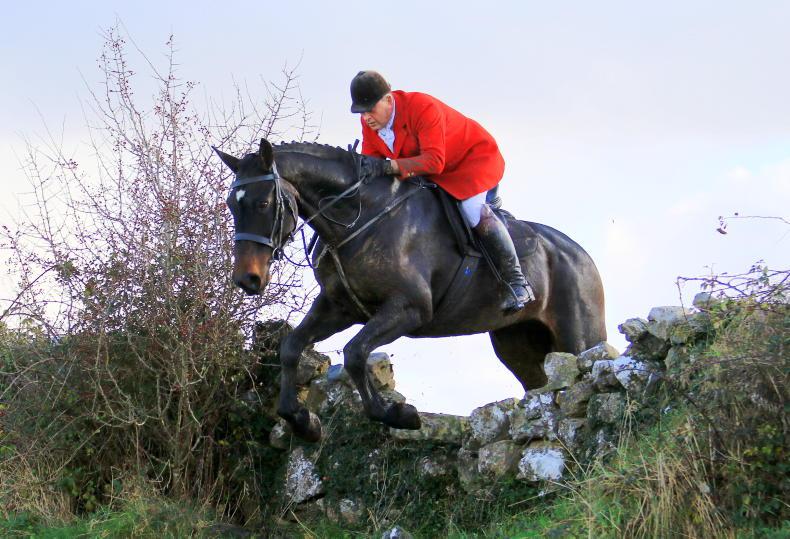 P J Burke takes the wall in his stride at Fethard with the Tipperary Foxhounds \ Catherine Power