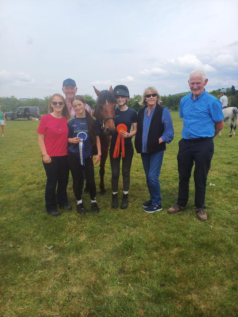 Katelyn Horgan and Wrenwood Kingsley winners of the Carleton Stables 148 1.20m Pony Super League Qualifier at Maryville on Sunday, being presented with their rug and rosette by sponsor Philip Horgan of Carleton Stables